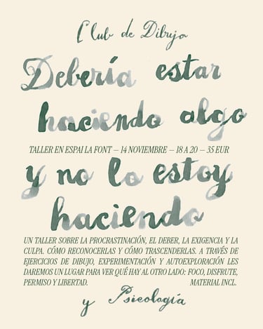 Un taller sobre la procrastinación, el deber, la exigencia y la culpa. Cómo reconocerlas y cómo trascenderlas. A través de ejercicios de dibujo, experimentación y autoexploración les daremos un lugar para ver qué hay al otro lado: foco, disfrute, permiso y libertad.